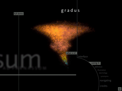 | INTRODUCTION: the overall shape of the structure made up from the individual words of the english language is apparent. the words are plotted along three axes: time, | familiarity and alphabetic. the color of the words denote national origin. the shape of gradus allows insights into the history of english. |
