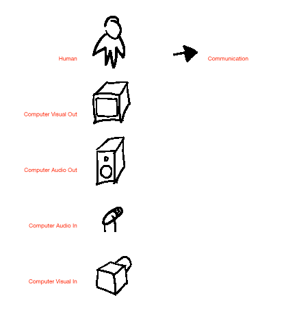 In this section we define the basic structure of the new system model language. In its current state, the language has twomain grammar types: actors and actions. By nature of being interactive, the computer both listens and speaks, i.e. there is an "input" and an "output." An actor may either be a human or a computer input or output. The computer input or output actor may be one of the following: "computer visual in", "computer audio in", "computer visual out", "computer audio out", or "human interface." There is one single action called "communication." According to this language, an interface may be defined by a visual combination of actors and actions. This language will evolve through the analysis and creation of additional performance systems.