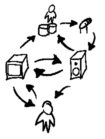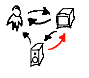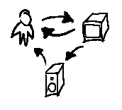 We see a single human that can manipulate a visual output. This visual output affects an audio output. The human can inturn see the visual output and hear the audio output which modulate his or her communication with the system.