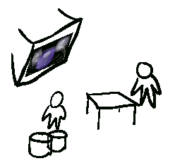 In the above image we see some of the same pictographic building blocks from the design language transferred into a sketch of a proposed performance space. This can be seen as an advantage of the language. It is an intuitive step to transform the sketch to a system model diagram: