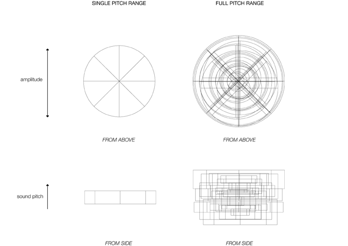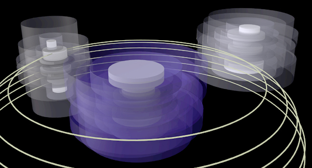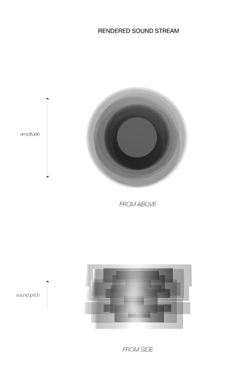 | This project attempts to create a visual language for understanding and manipulating sampled audio streams. First, a given audio source is split into a range of pitches. Each pitch range is represented as a single cylinder. The amplitude of a pitch can be seen in the diameter of its corresponding cylinder. A complete sound stream forms a solid structure of combined cyliners. The sounds structure bends and transforms based on the changing audio source. |