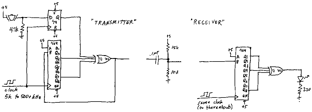 For transmitter: 1/2 74HC74 D-flop, 1 74HC164 shift register (serial in, parallel out; taps at bits 3 and 7), 1/2 74HC86 XOR. Pushbutton (undebounced, but who cares?), 4.7k 1/8W resistor.