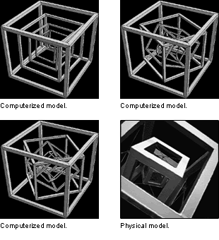 I dreamt of a cube rotating on three orthogonal axes, but awoke to find that I could not accurately imagine such a motion. I modeled it in Mathematica then built a motorized physical model. The computer model contains one more layer of depth of nesting and rotation than the physical model.